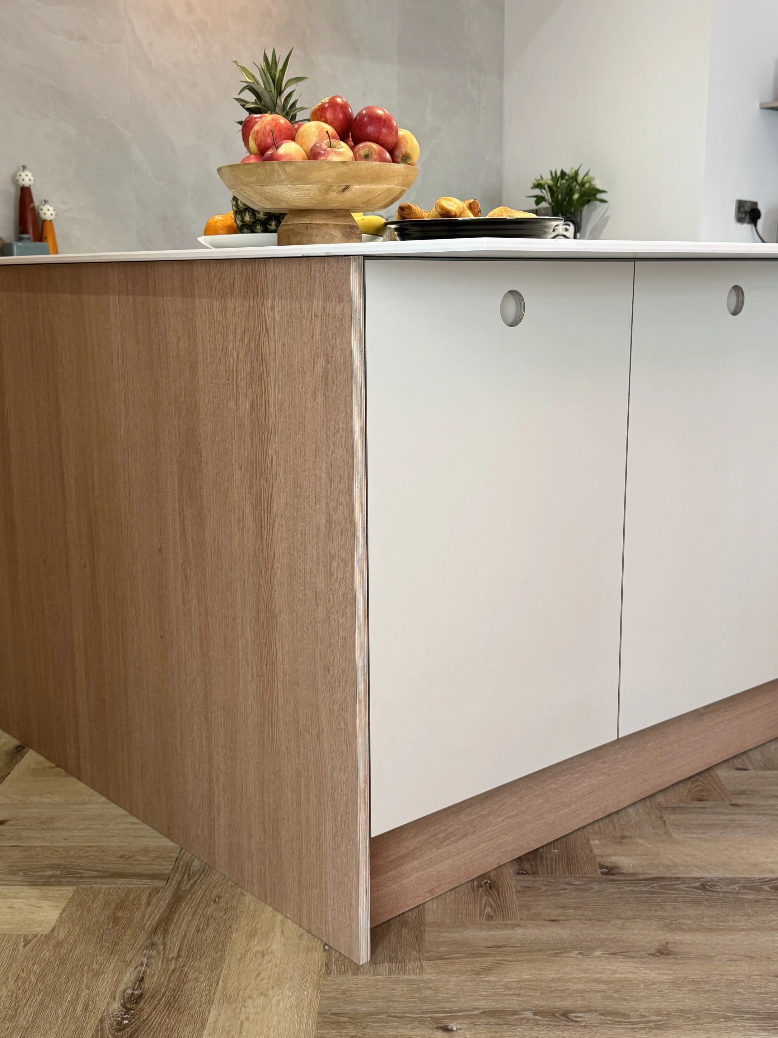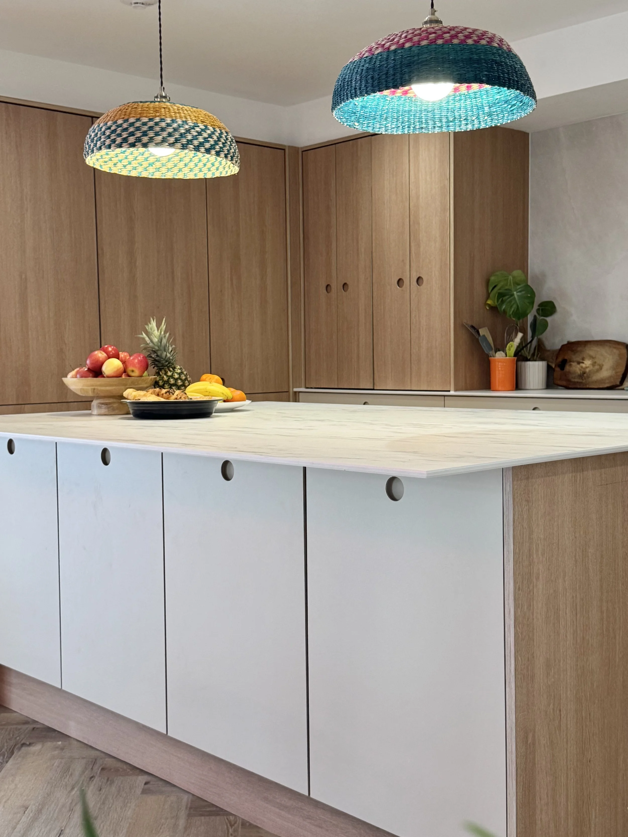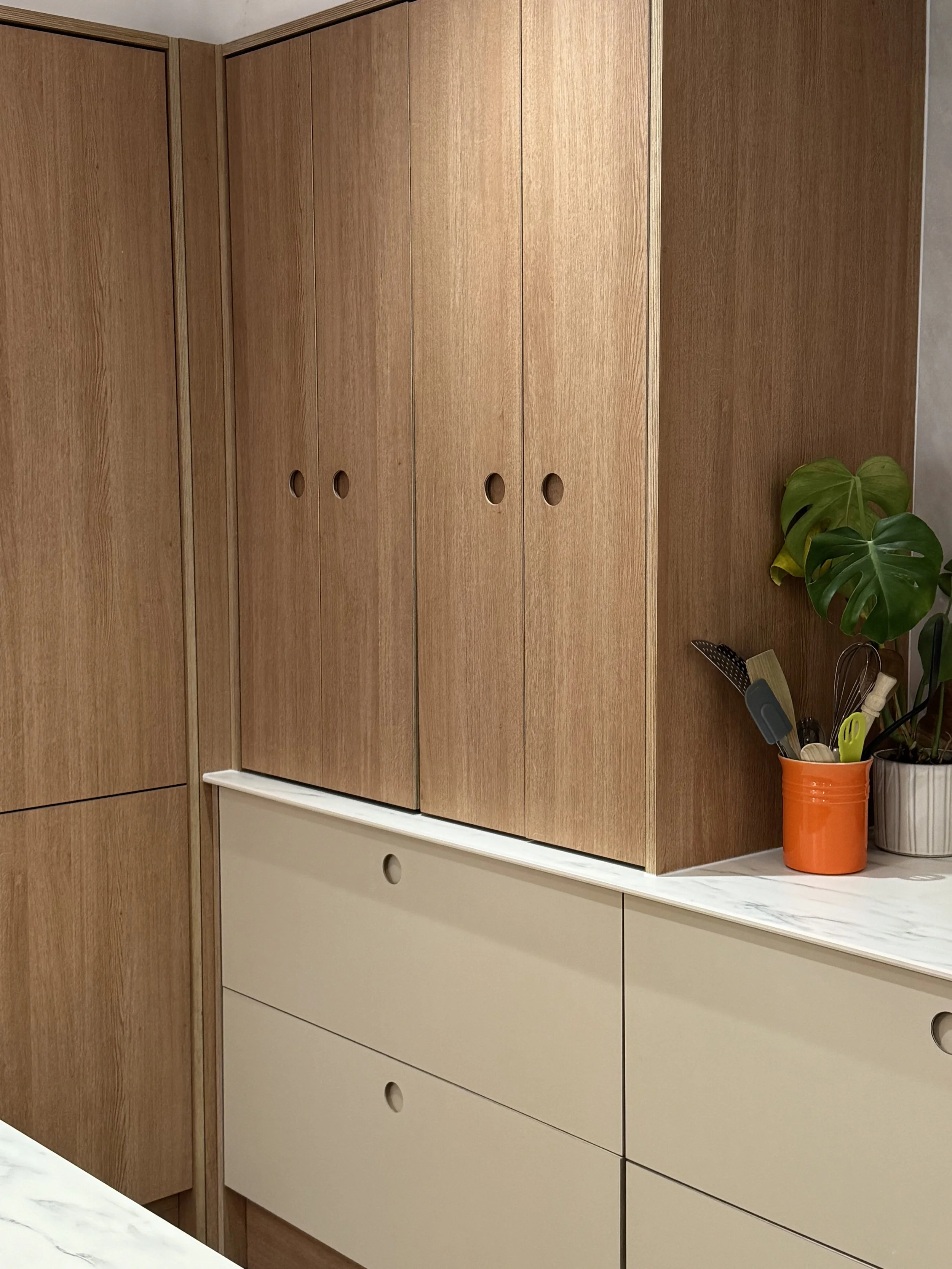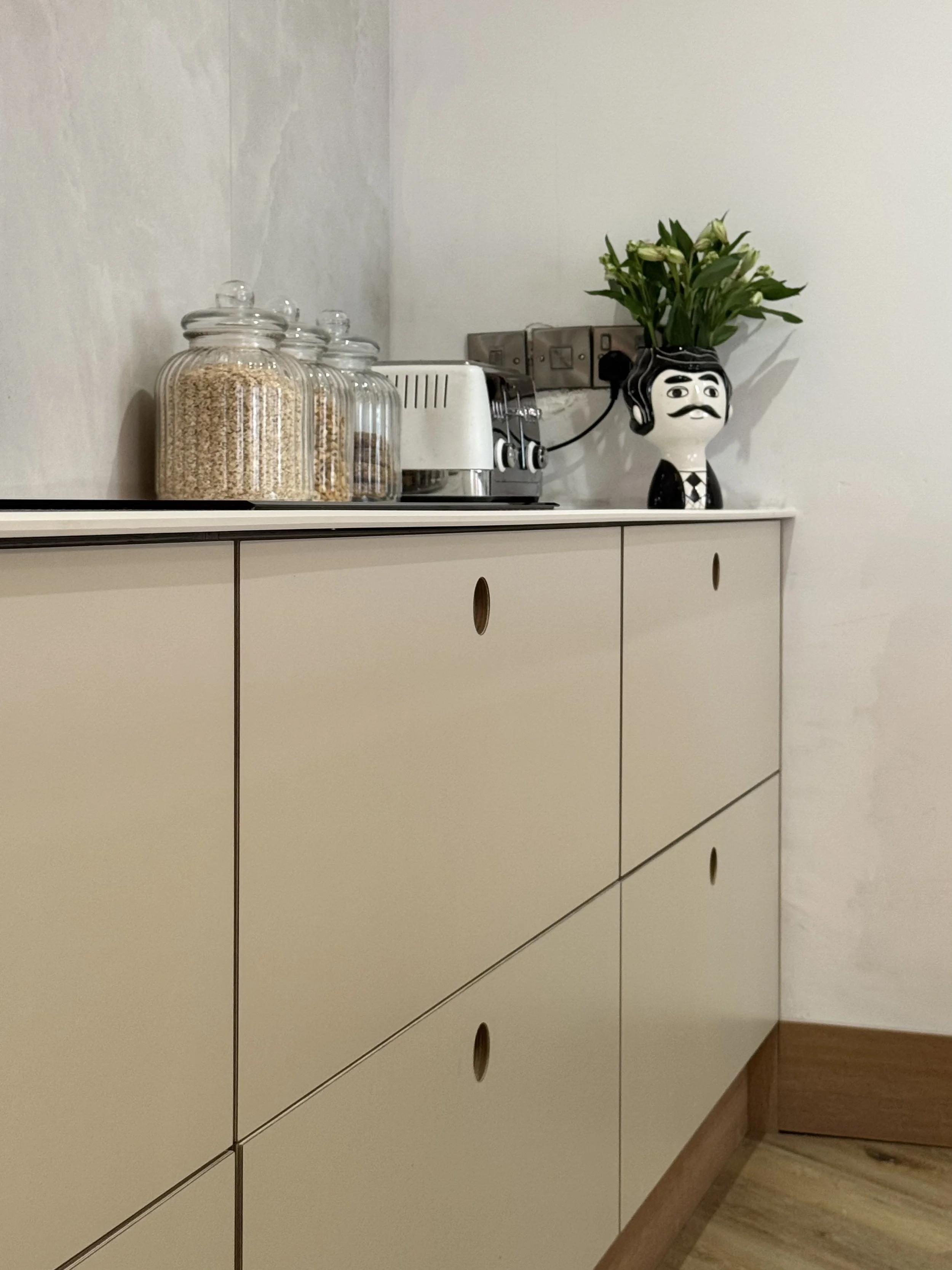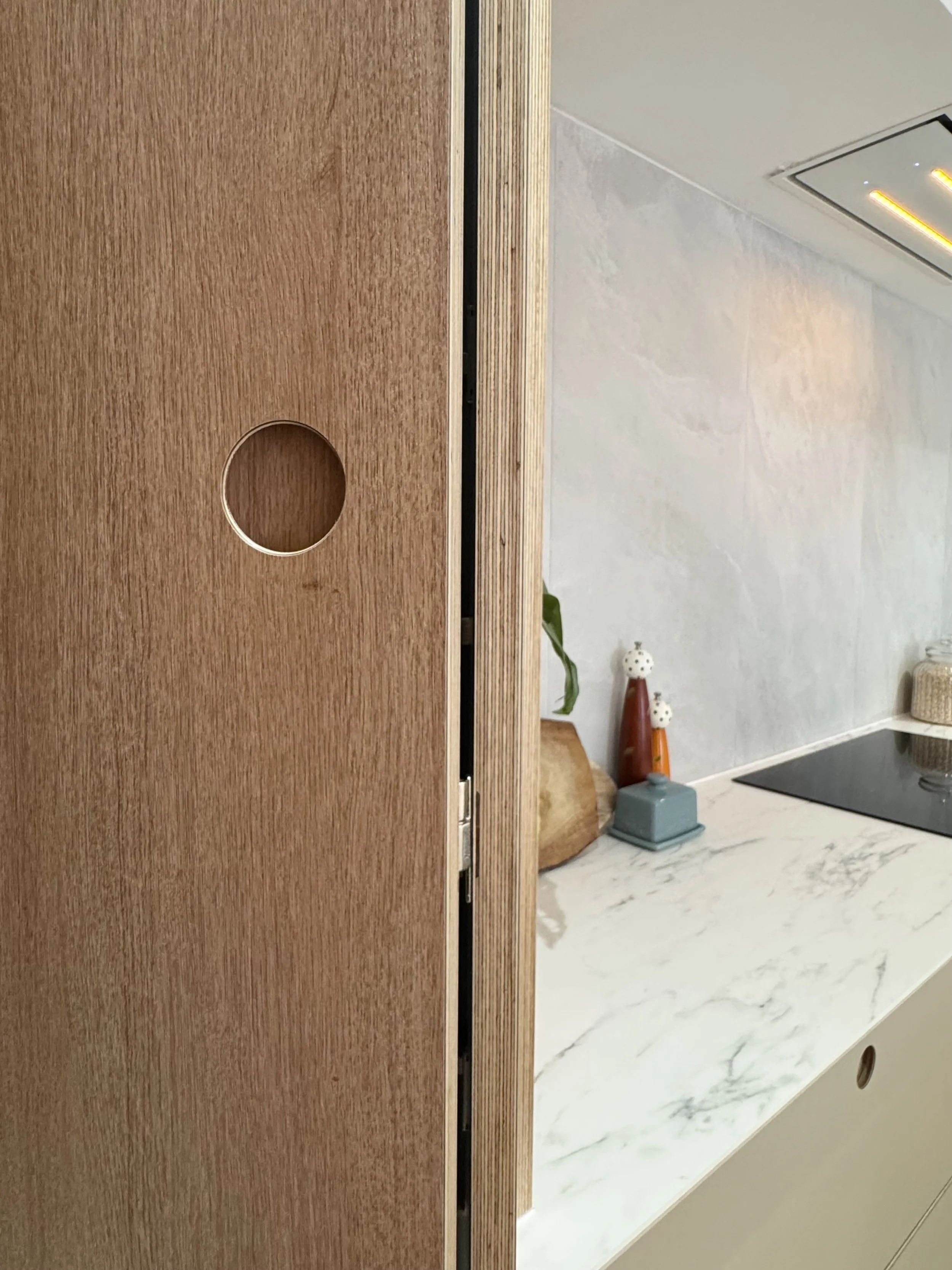 Location : Newquay, CornwallCabinets: Sum Of All Parts Birch PlywoodMaterials and finishes: Birch Plywood doors with Formica laminates (Smoked Oak and Pumice)Handle detail : Circle Handle detailing with matching laminate reveal