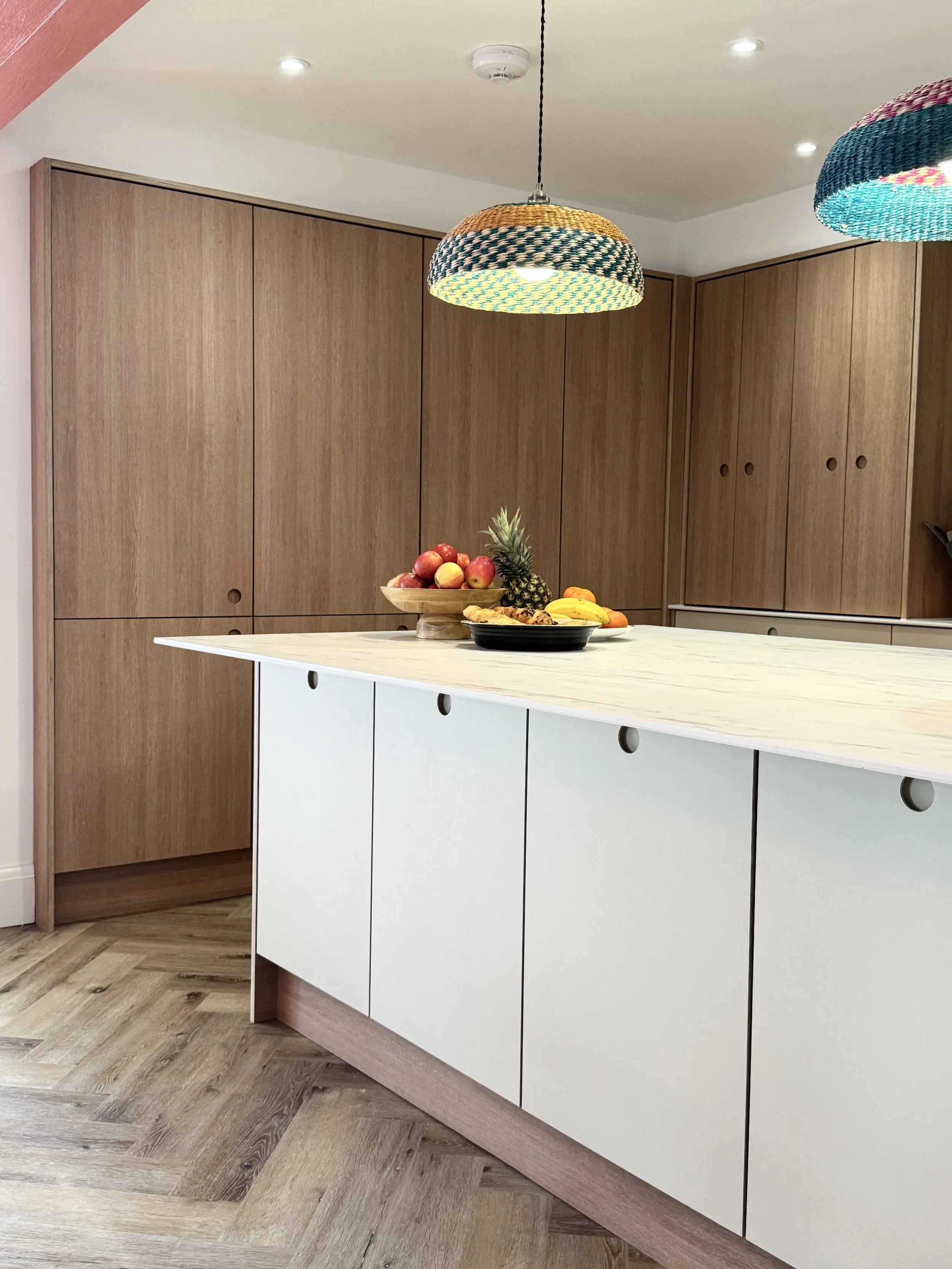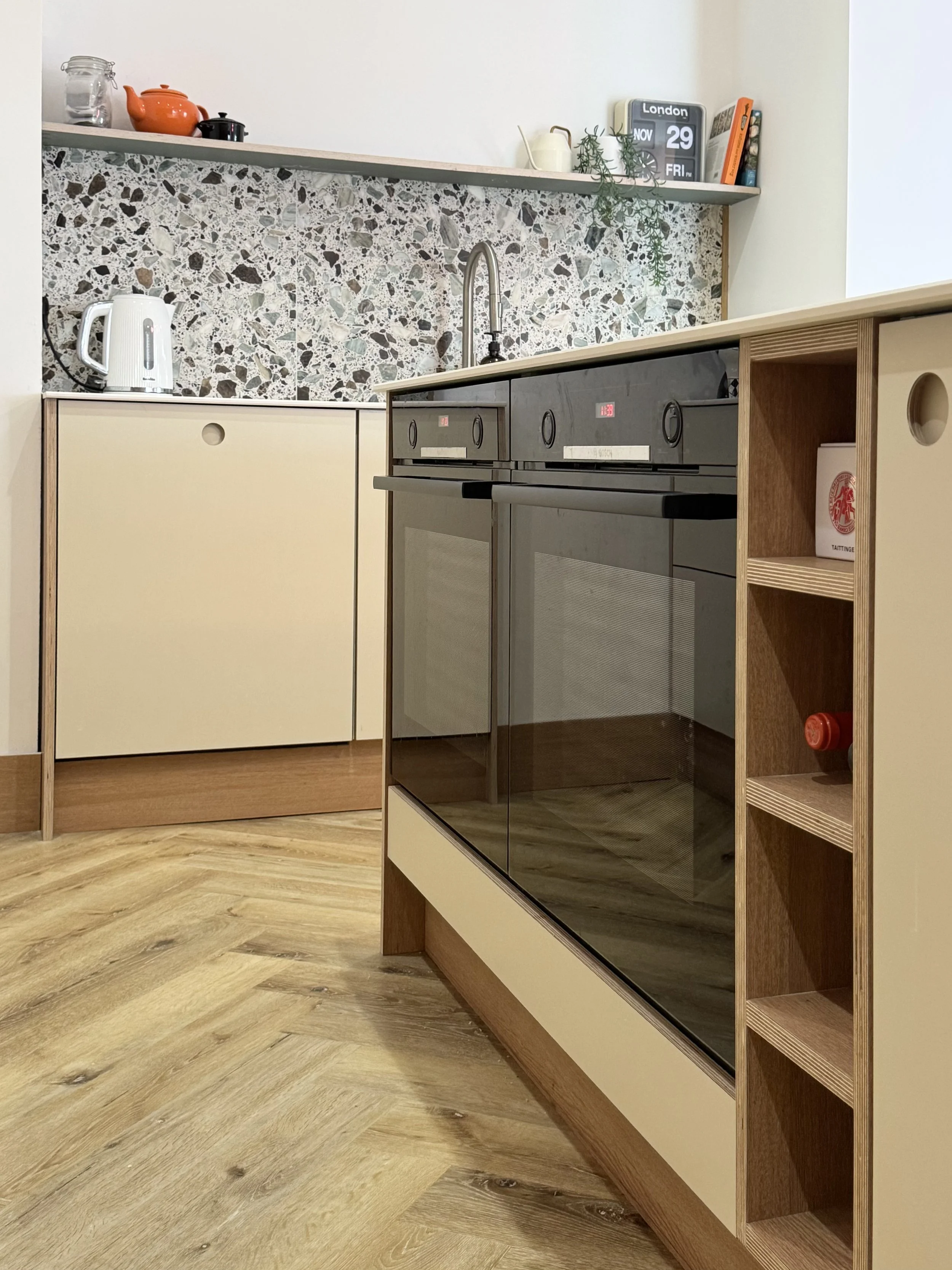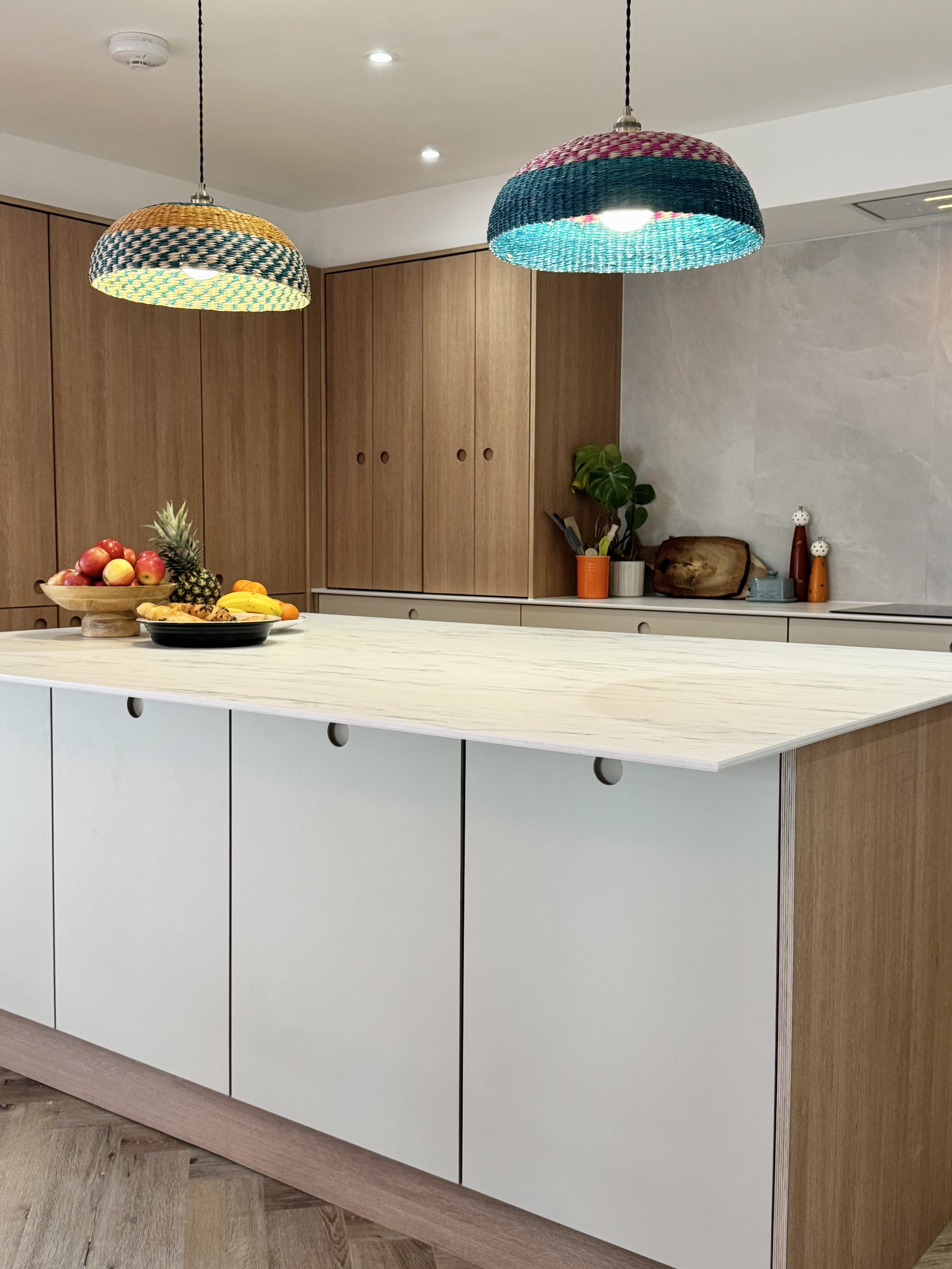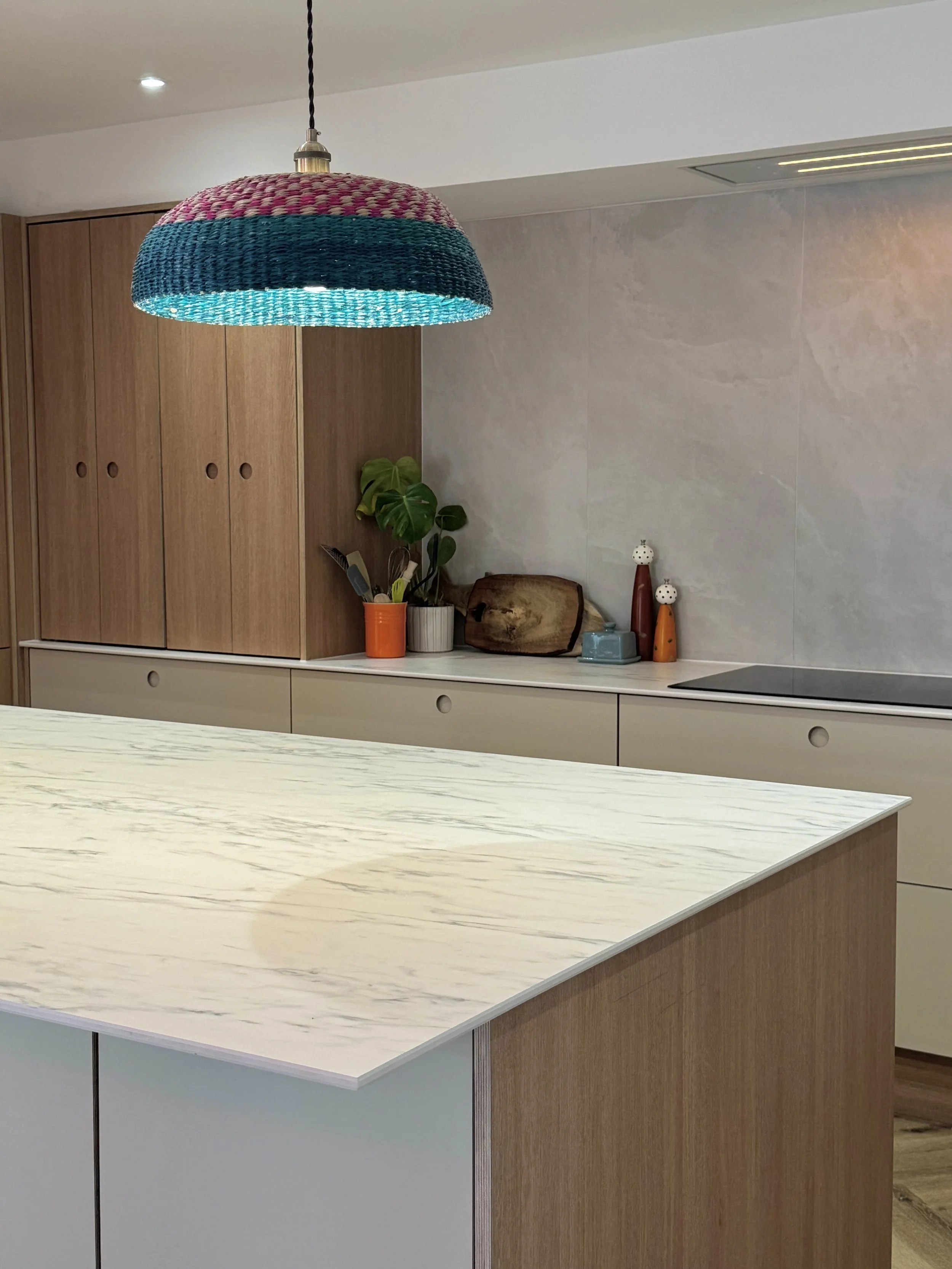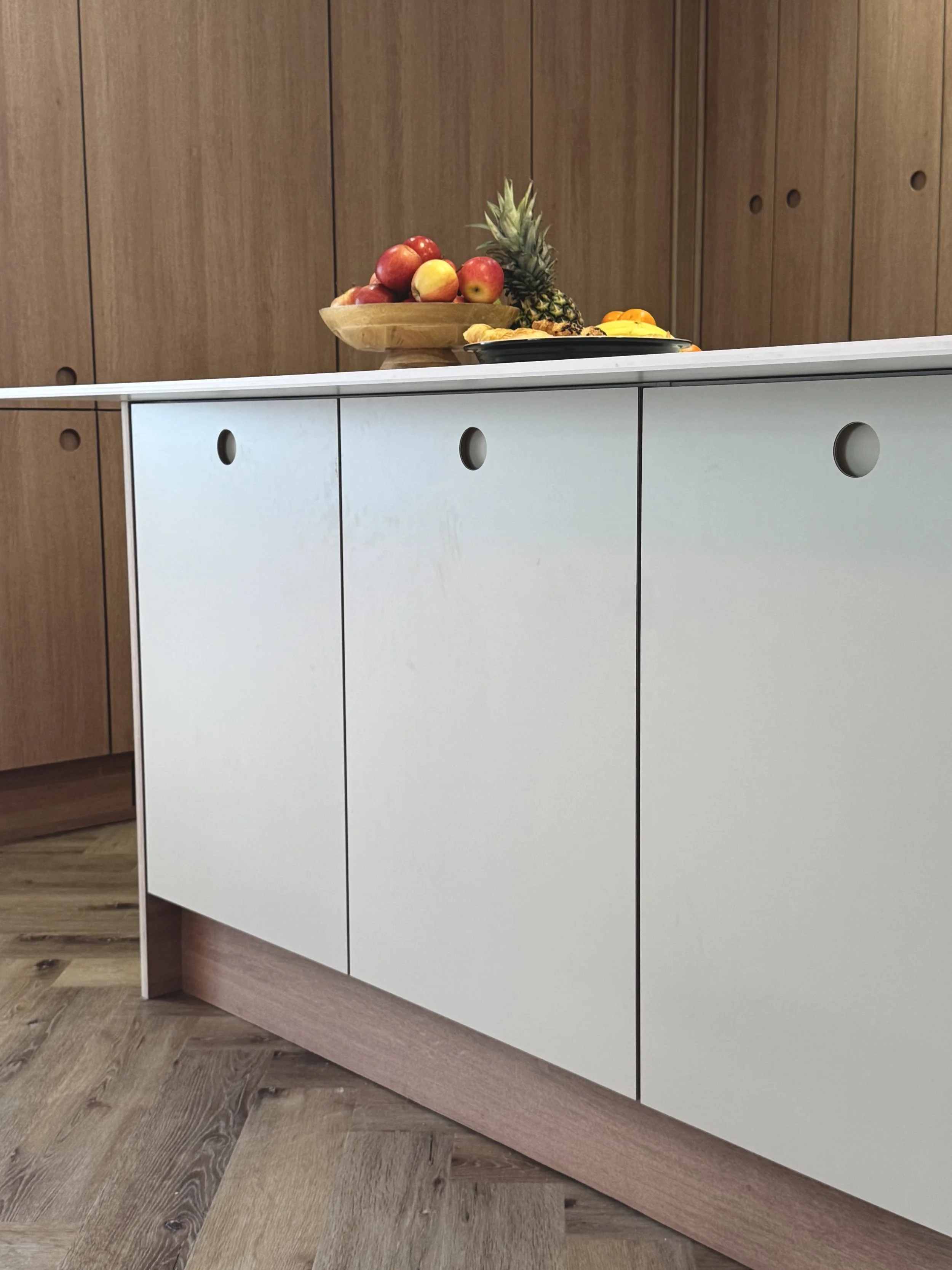 Location : Newquay, CornwallCabinets: Sum Of All Parts Birch PlywoodMaterials and finishes: Birch Plywood doors with Formica laminates (Smoked Oak and Pumice)Handle detail : Circle Handle detailing with matching laminate reveal