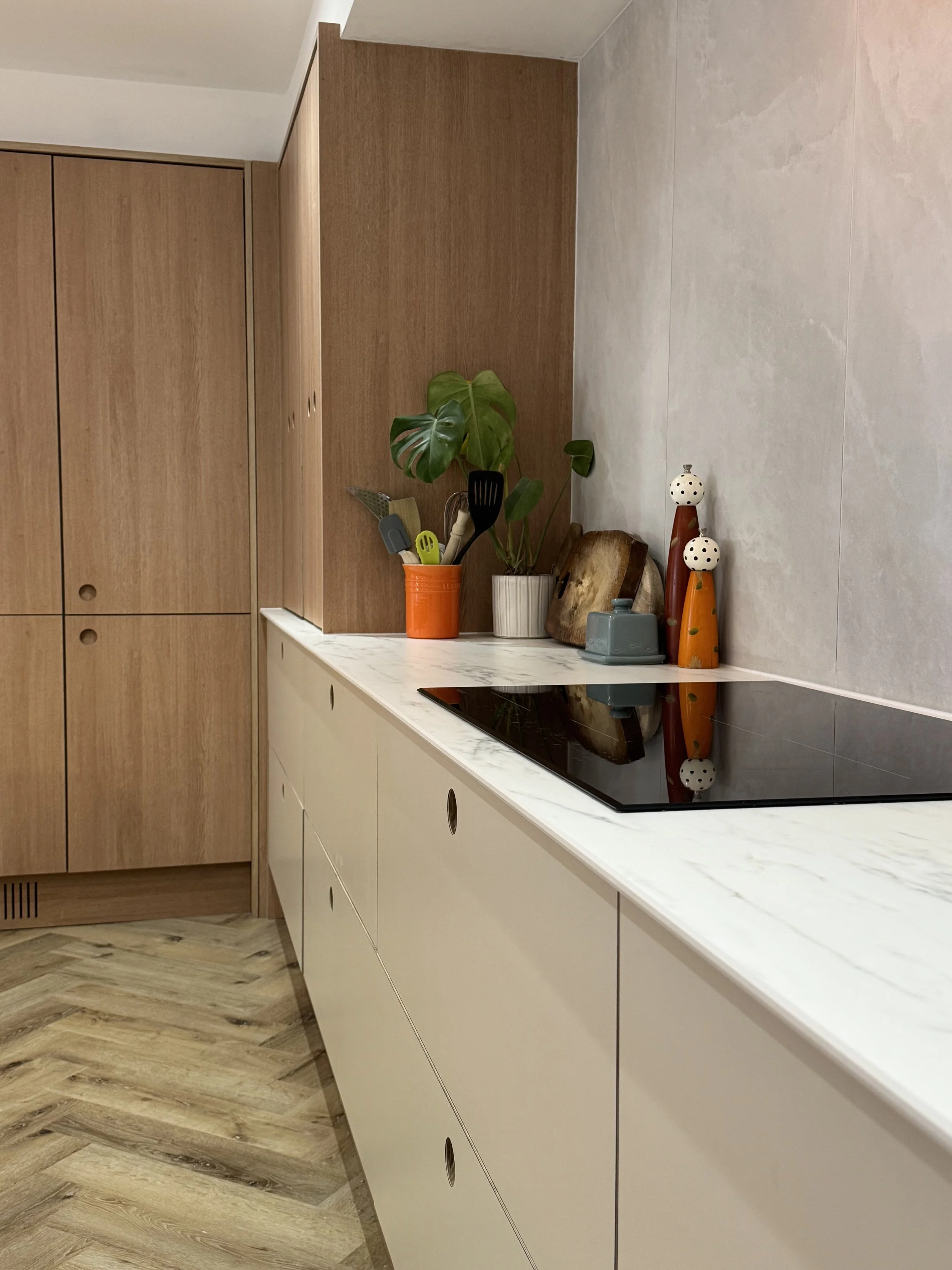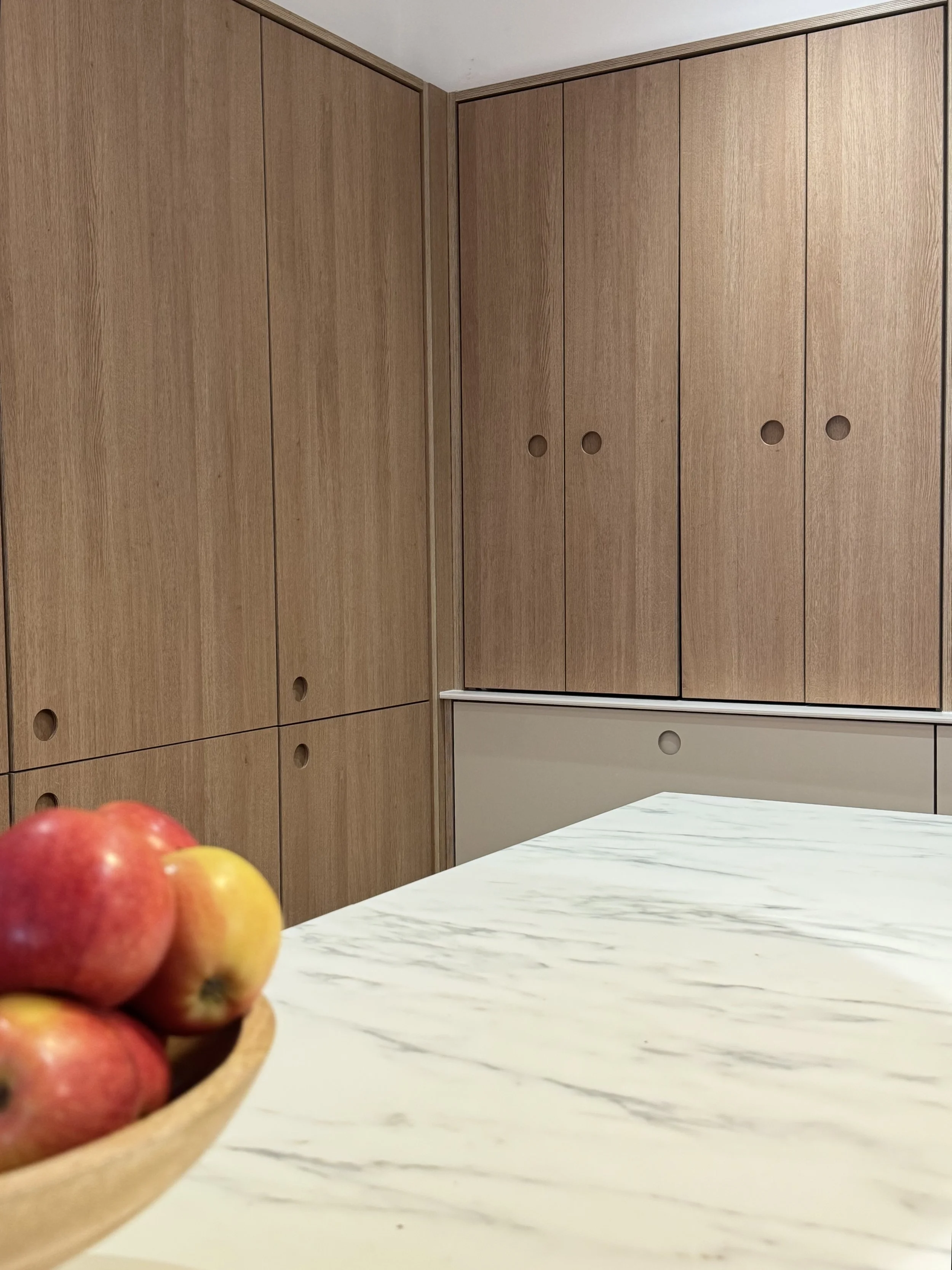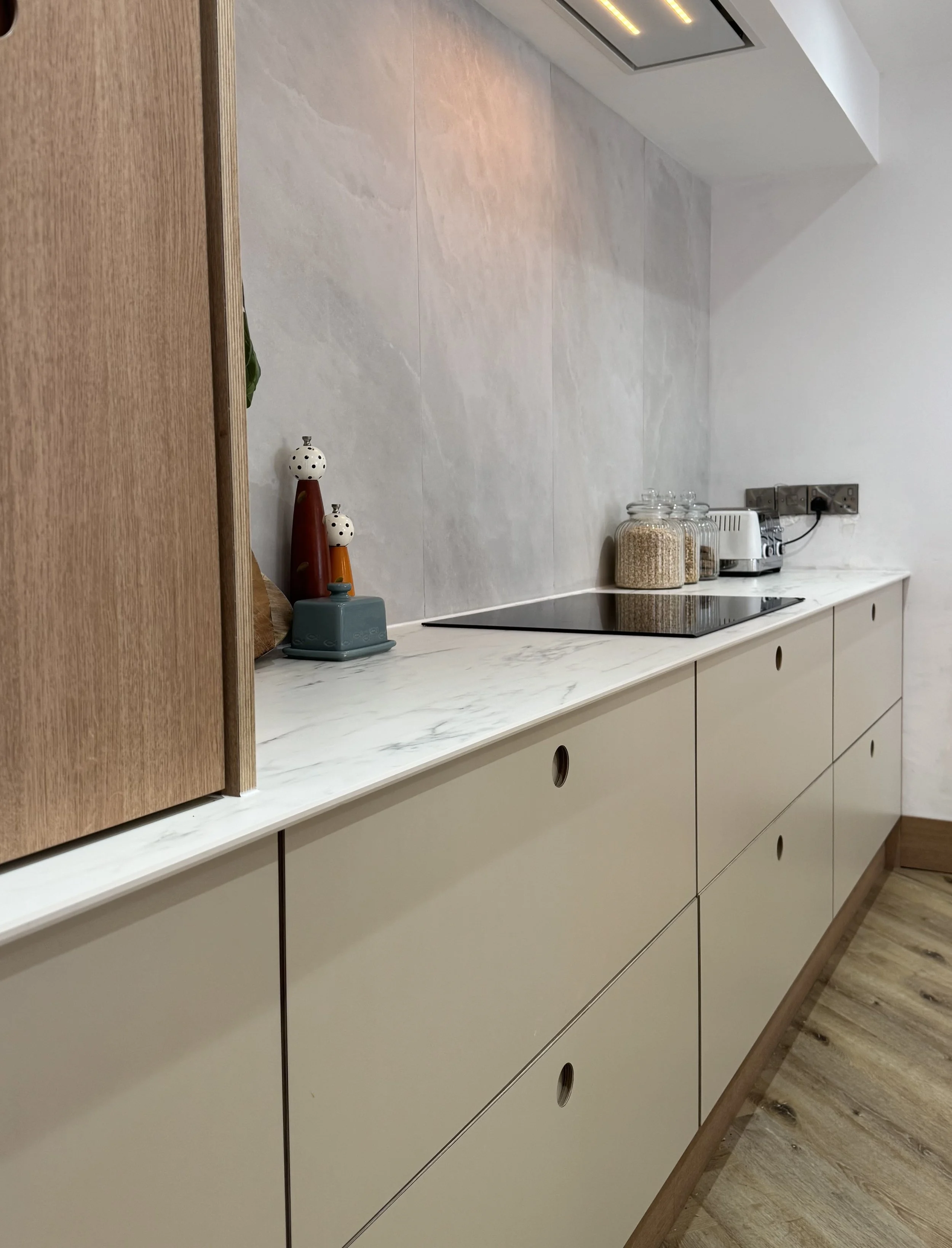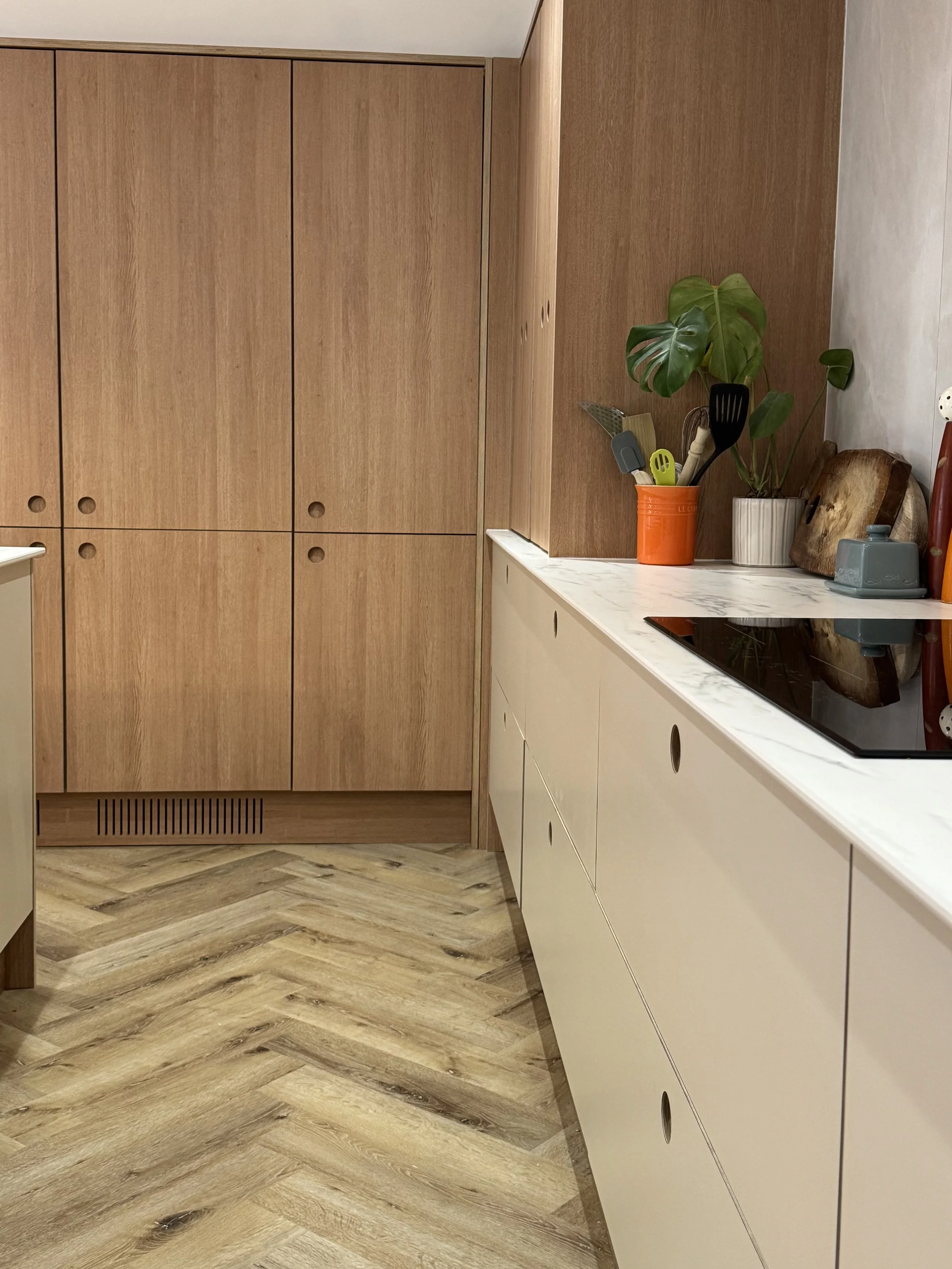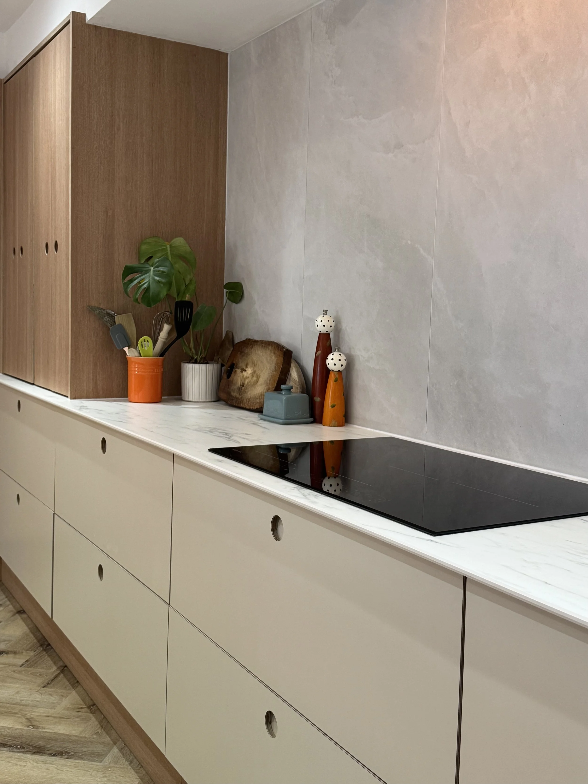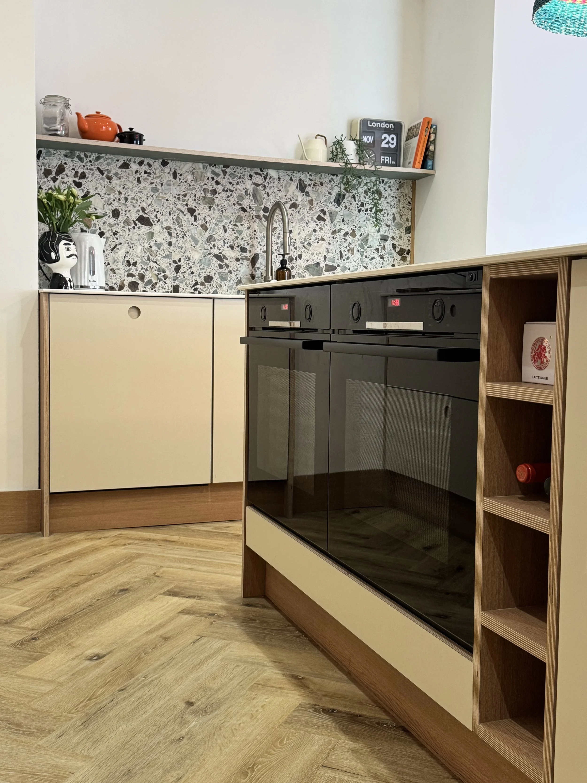 Location : Newquay, CornwallCabinets: Sum Of All Parts Birch PlywoodMaterials and finishes: Birch Plywood doors with Formica laminates (Smoked Oak and Pumice)Handle detail : Circle Handle detailing with matching laminate reveal