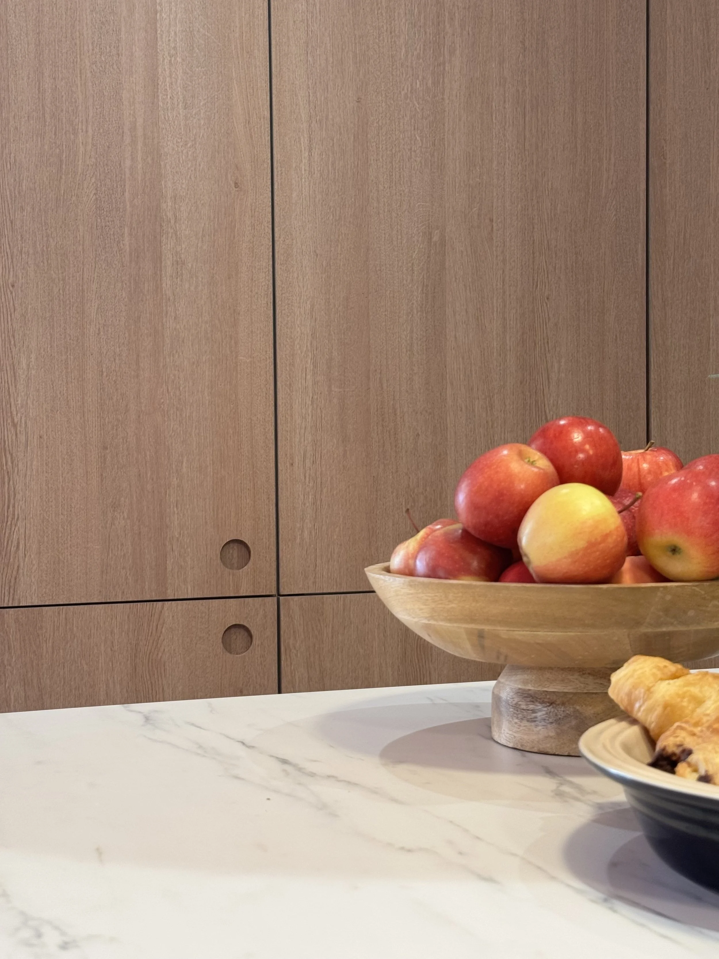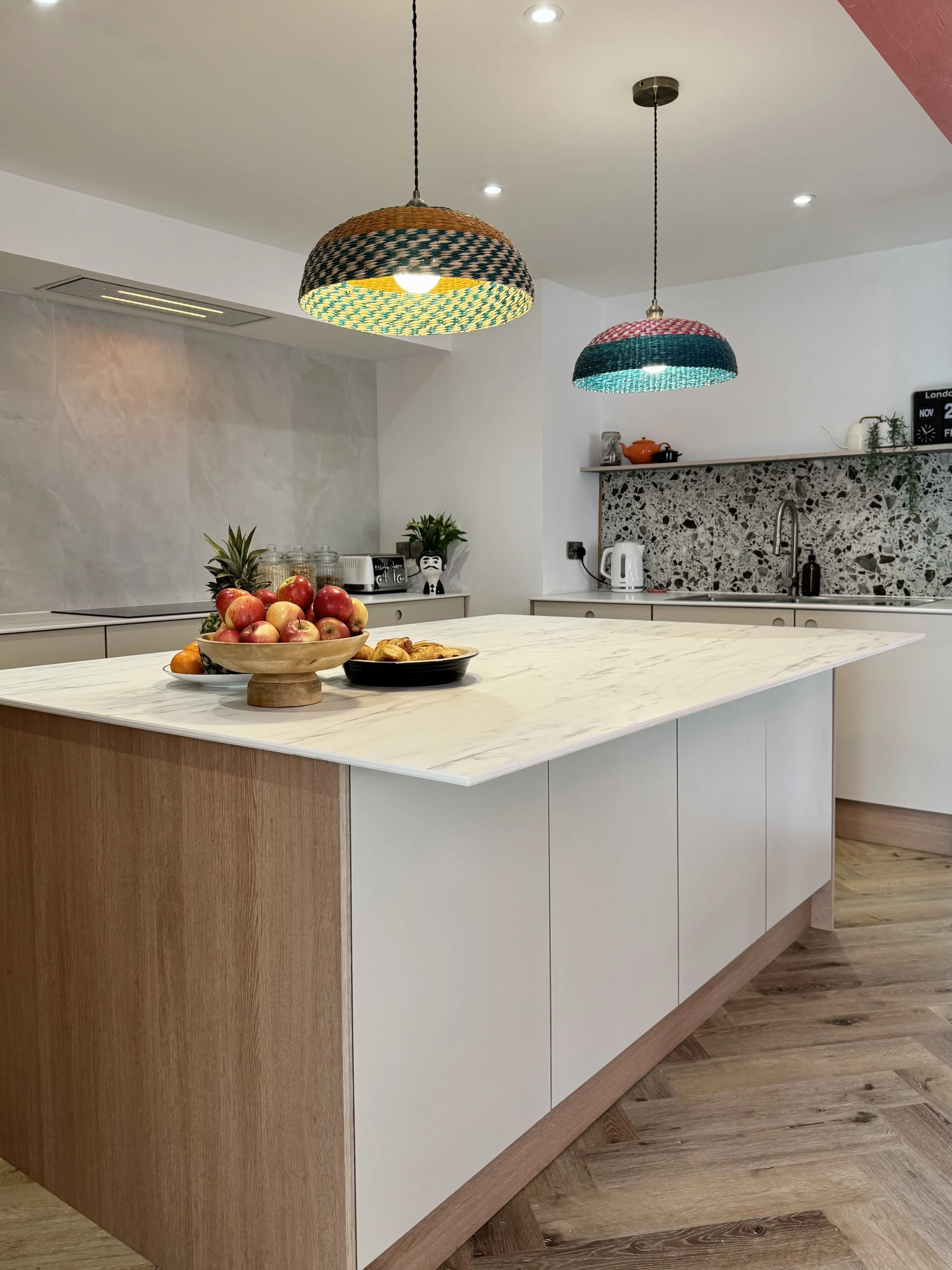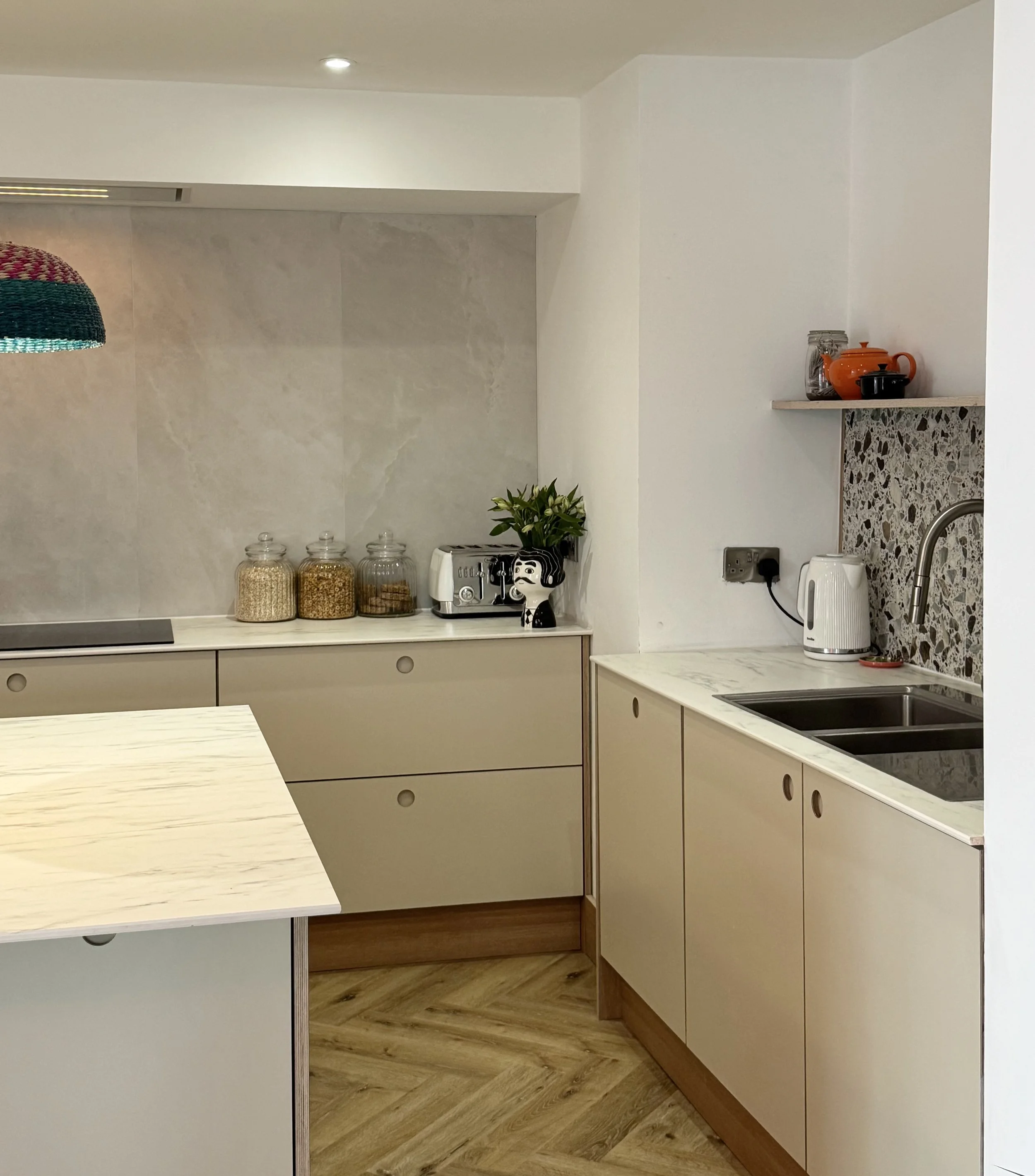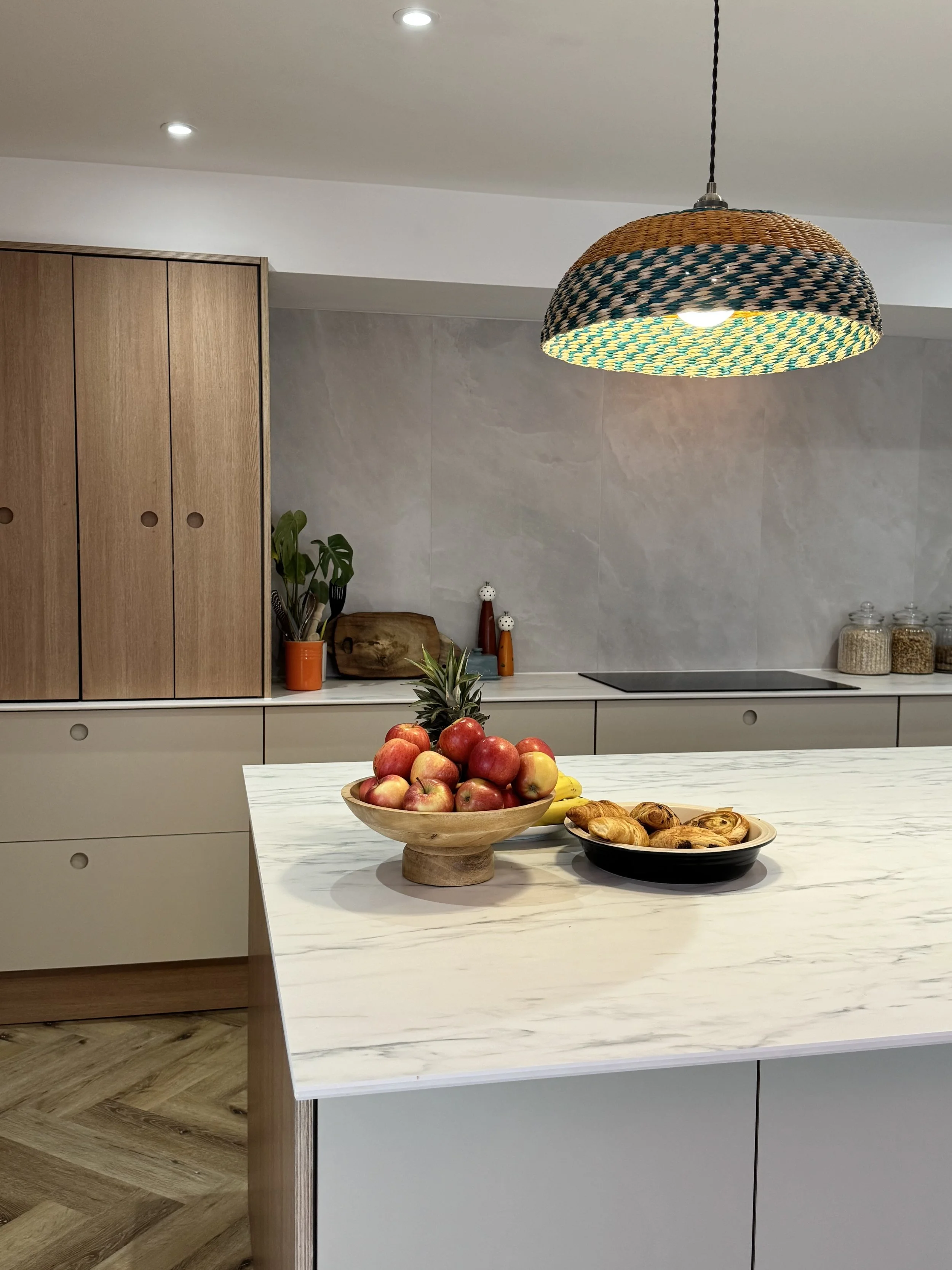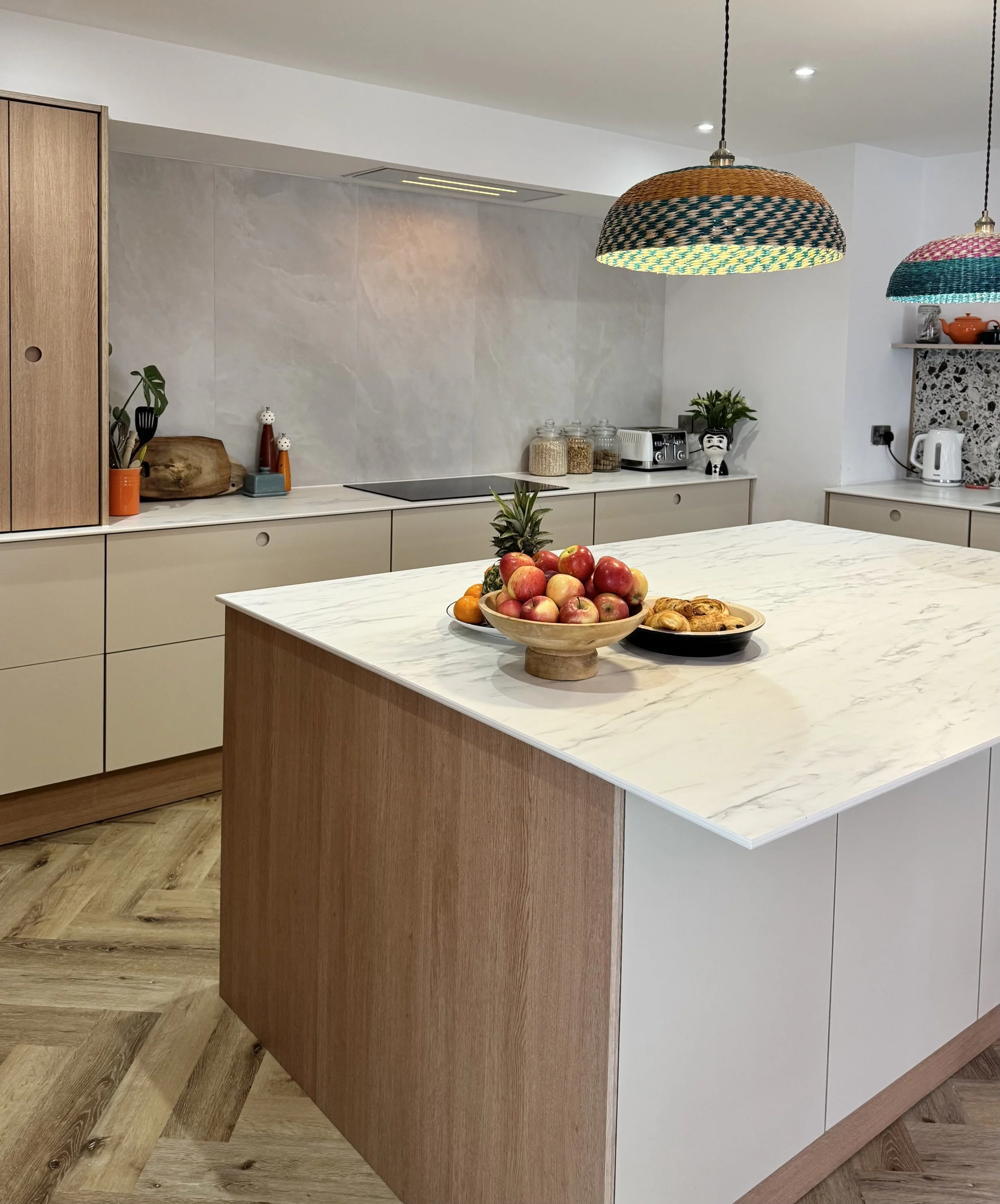 Location : Newquay, CornwallCabinets: Sum Of All Parts Birch PlywoodMaterials and finishes: Birch Plywood doors with Formica laminates (Smoked Oak and Pumice)Handle detail : Circle Handle detailing with matching laminate reveal