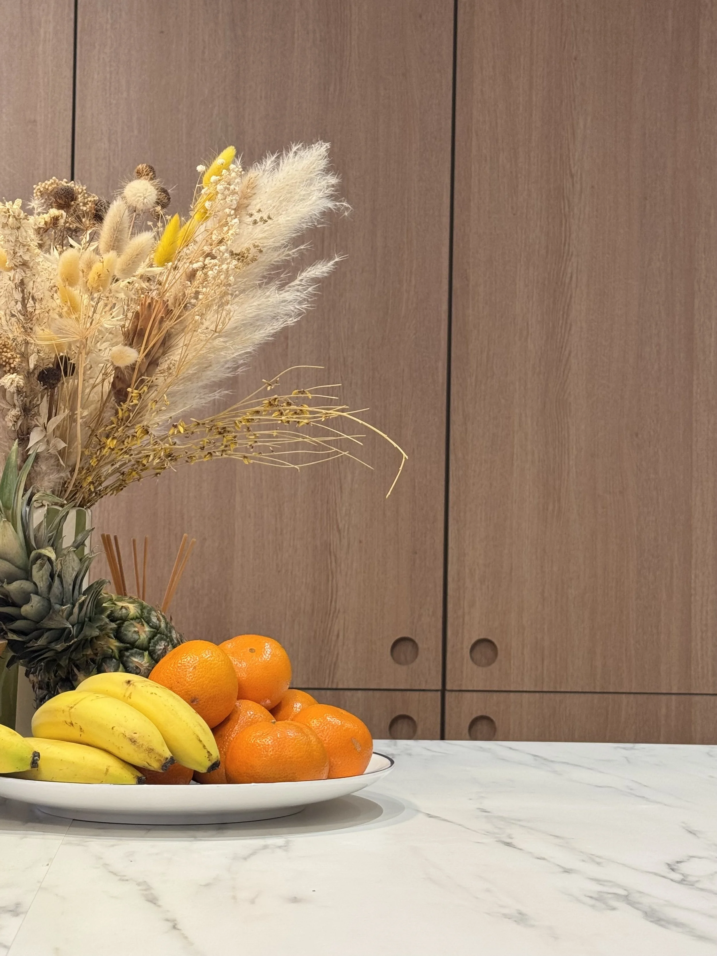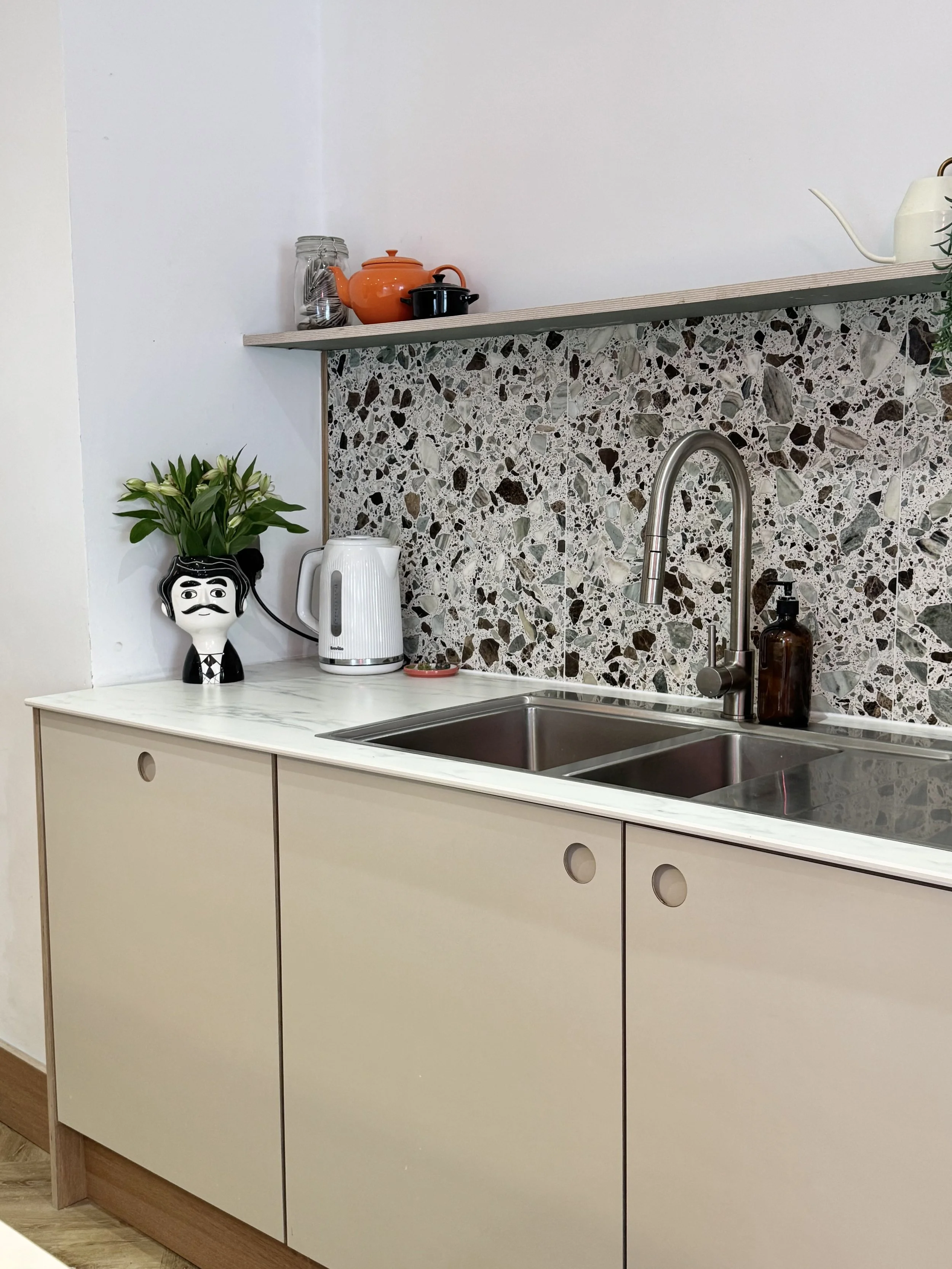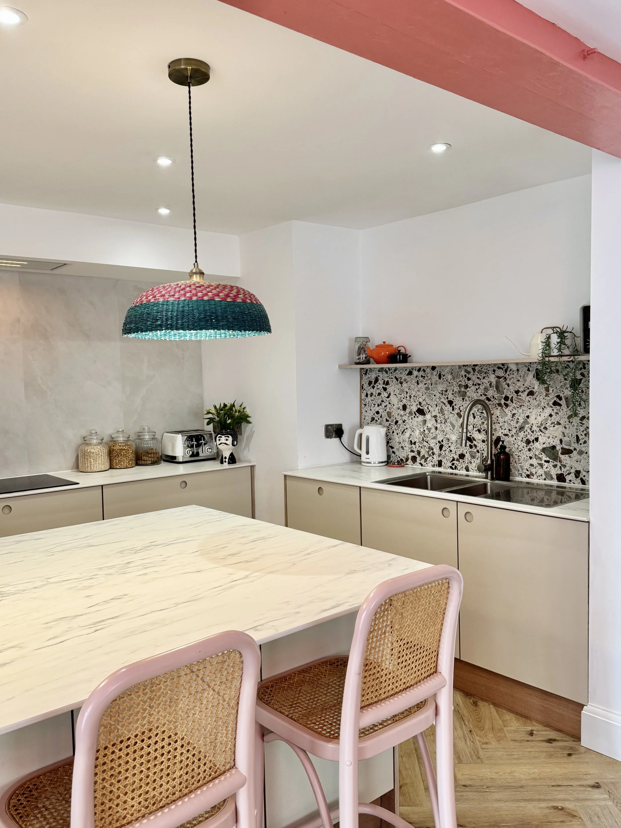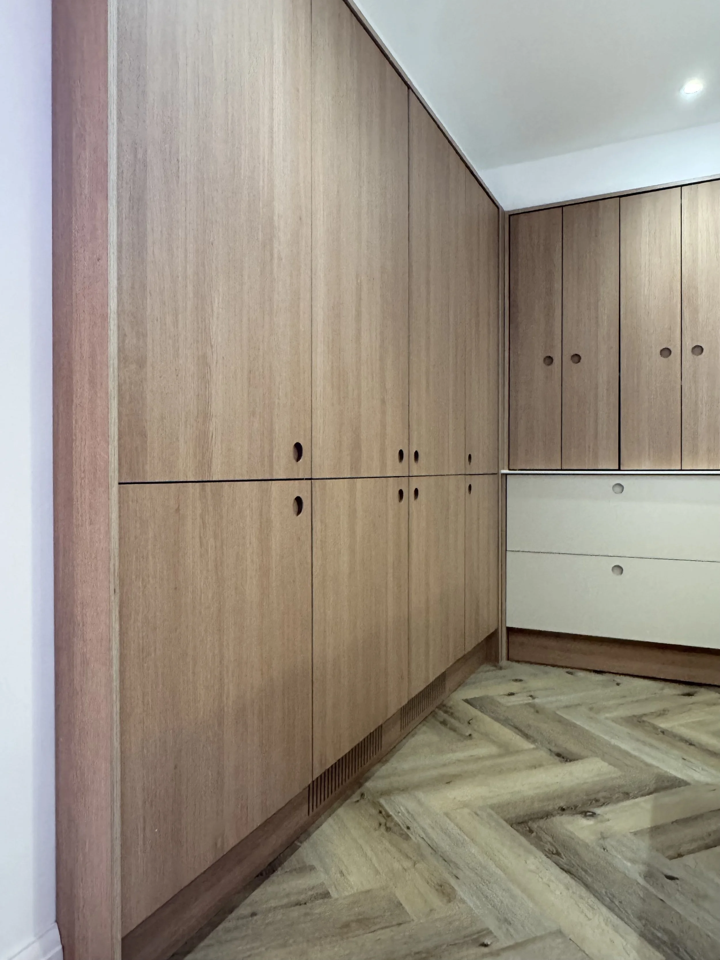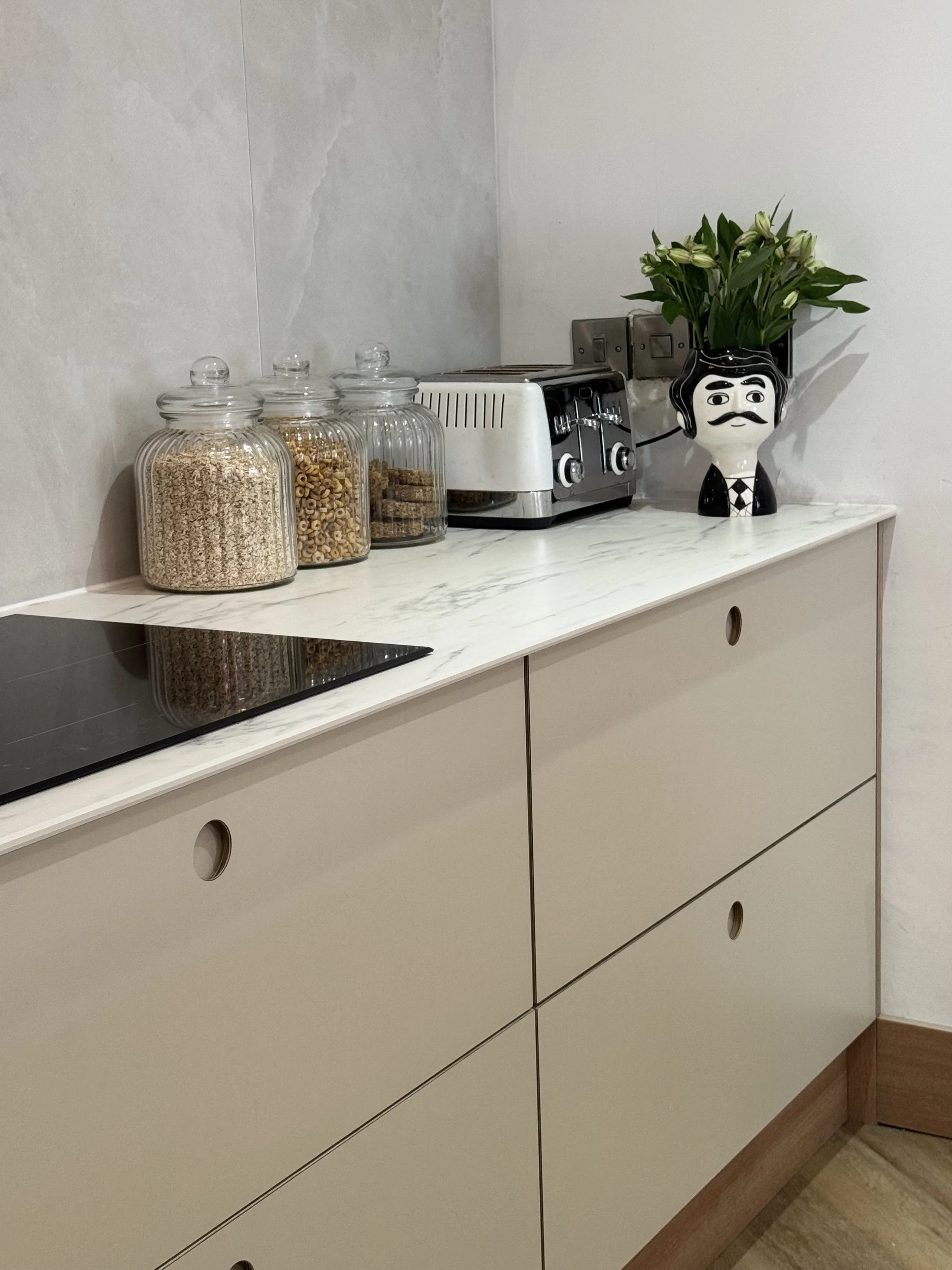 Location : Newquay, CornwallCabinets: Sum Of All Parts Birch PlywoodMaterials and finishes: Birch Plywood doors with Formica laminates (Smoked Oak and Pumice)Handle detail : Circle Handle detailing with matching laminate reveal