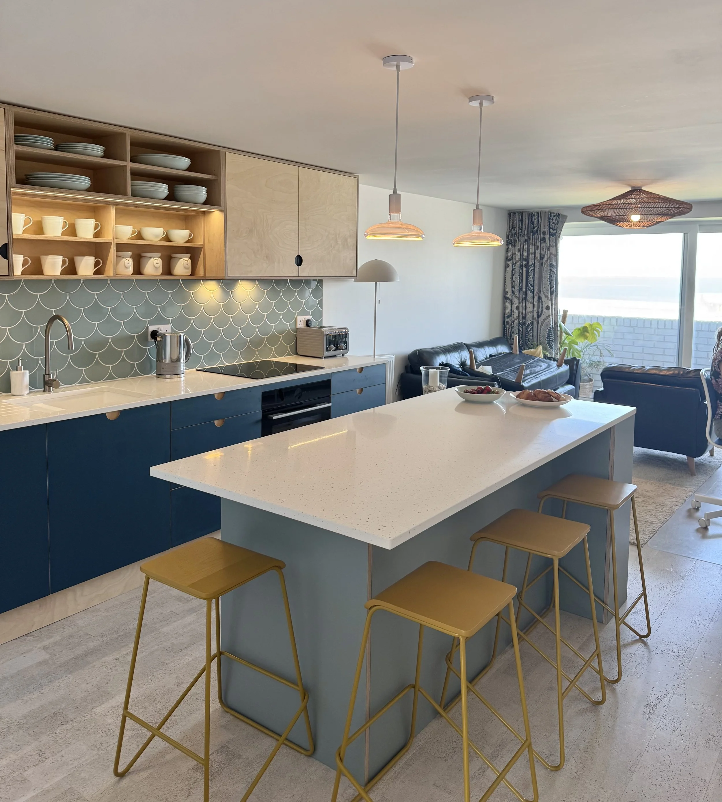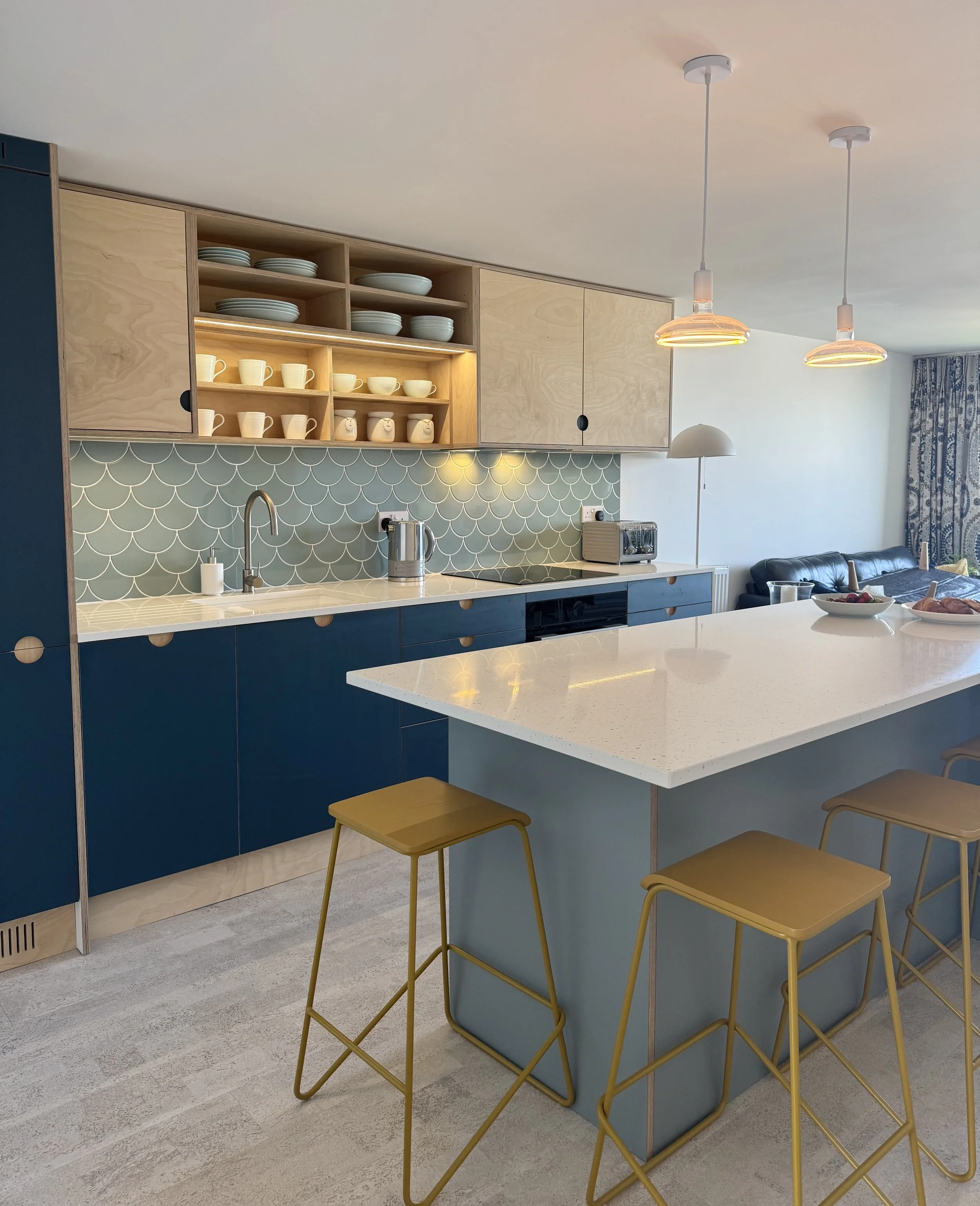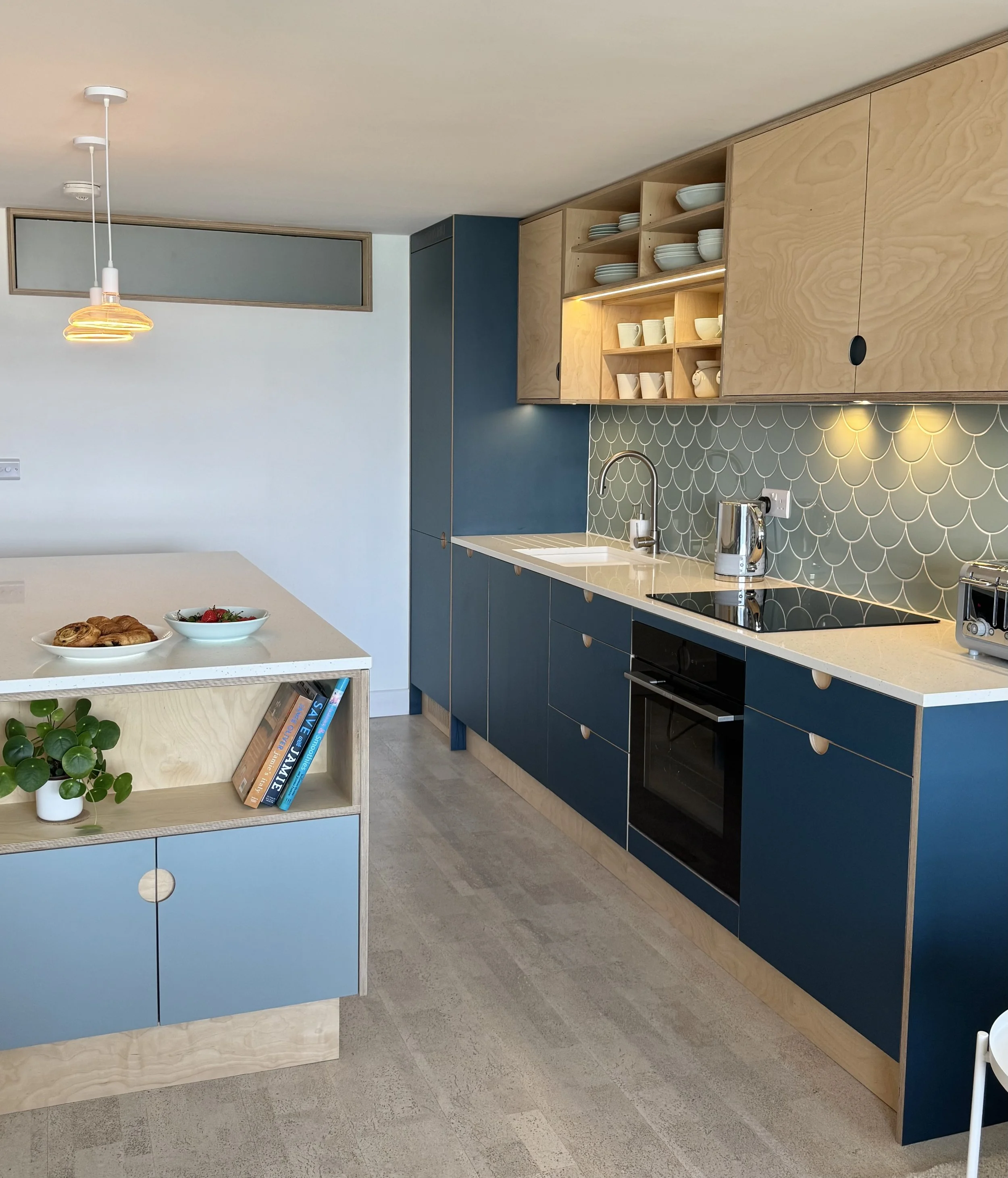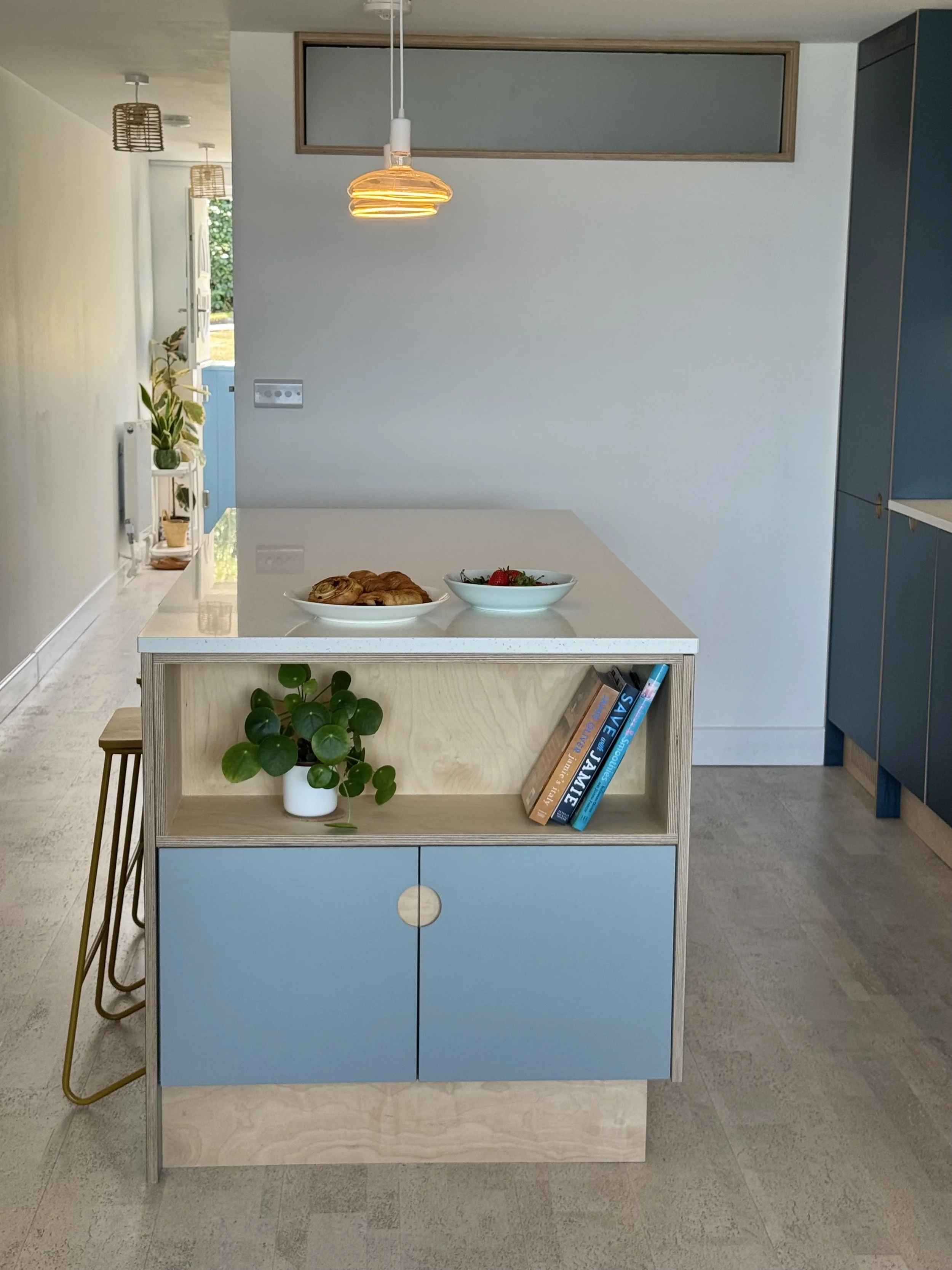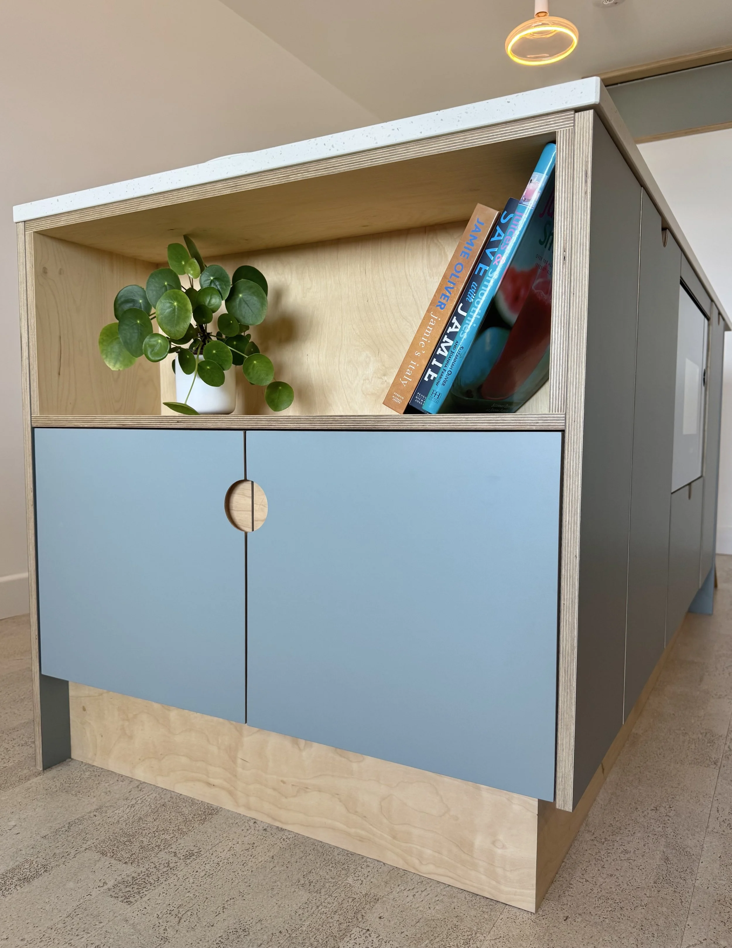 Materials and finishes: Birch Plywood doors with two blue Formica colours. Oiled Birch Plywood wall unit doors and panels. Copper Stipple Solid surface worktop- fabricated and fitted by Sum Of All Parts.